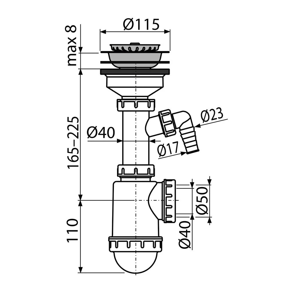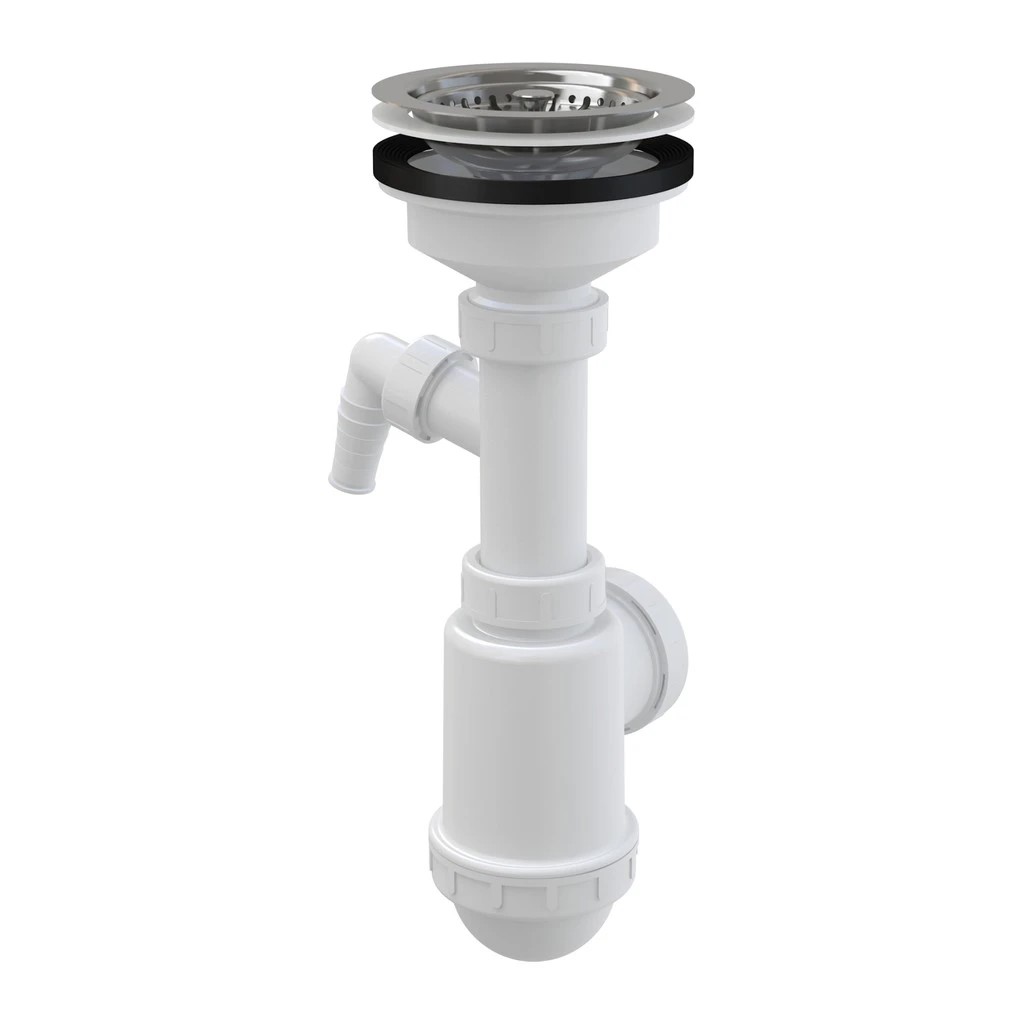 Drezový sifón, Materiál: polypropylén, Vývod odpadu pripravený pre napojenie odpadovej rúrky Ø50 mm alebo Ø40 mm, S prípojkou pre práčku alebo umývačku riadu, Sitko na výpuste slúži aj ako zátka