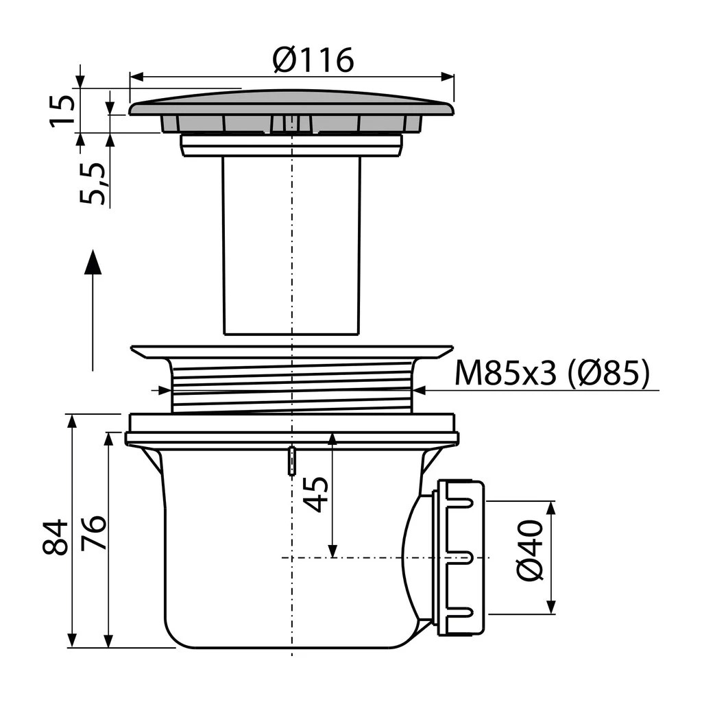 Vaničkový sifón, Materiál: polypropylén, tepelne a chemicky odolný, Odpad je možné pripojiť pomocou kolena A52, Plne čistiteľný až po odpadové potrubie, Stavebná výška 84 mm, Pre sprchové vaničky bez prepadu, s odtokovým otvorom Ø90 mm