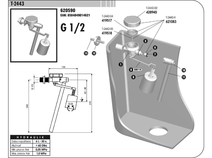 Napúšťací ventil bočný T-2443, pre WC nádržky, pripájací závit plastový 1/2"