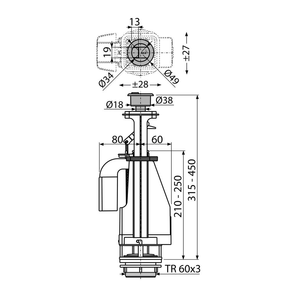 Vypúšťací ventil POPIS: Clona pre nastavenie množstva vypúšťanej vody, Konštrukcia umožňuje nastavenie optimálnej výšky ventilu podľa výšky nádržky, Materiál: ABS